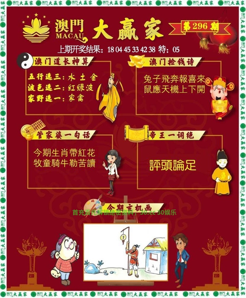 296期:今期生肖三九开,二四出门七相送。单码本期要反弹,八戒古时戏嫦娥。天字一发六可定,注意一三五发财。马中赤兔人最爱,顺手牵羊开好码。 |