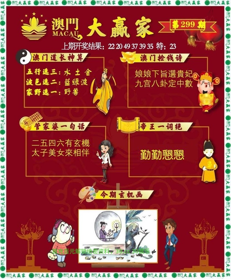 297期:今期生肖三六开,一七高悬二六明。小姐宫女左右伴,處事清閑一生樂。搅海翻江小七煎,可是四期开出特。看好合数二三五,伏妖降魔能制宜。 |
